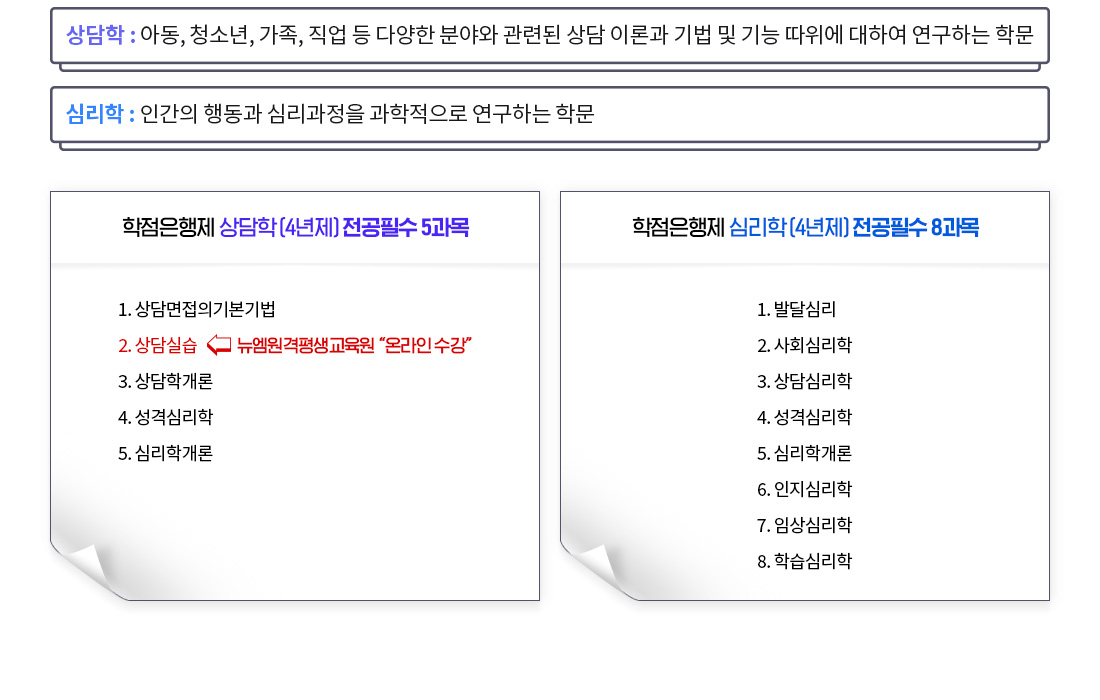 | 학점은행제 상담학 (4년제) 전공필수 5과목 | 1. 상담면접의기본기법, 2. 상담실습 (뉴엠원격평생교육원 “온라인 수강”), 3. 상담학개론, 4. 성격심리학, 5. 심리학개론 |