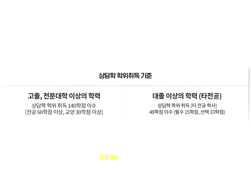 | 고졸, 전문대학 이상의 학력 상담학 학위취득 140학점 이수 (전공 60학점 이상, 교양 30학점 이상) |